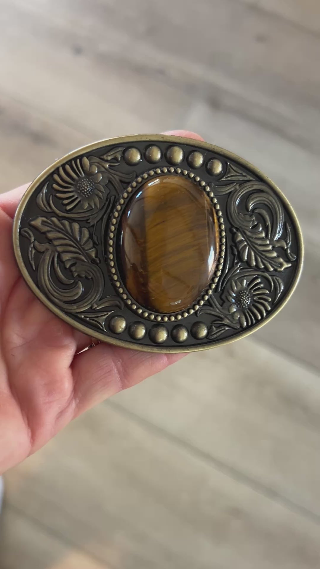 This antique gold western buckle real tigers eye stone. It fits with a metal bar and pin (for a snap on belt). Quality guaranteed, picture does not do this buckle justice! Would make a stand out addition to your belt.