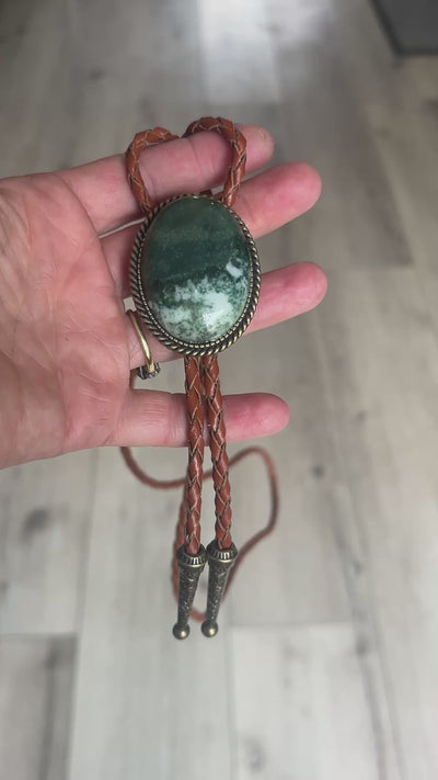 This awesome bolo tie has a southwestern design and green stone centerpiece.