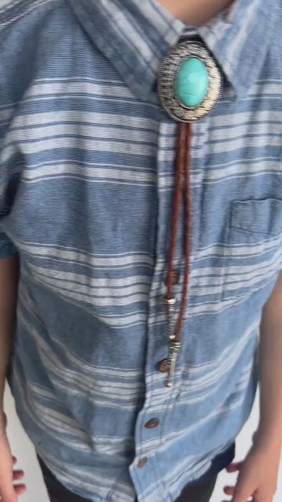 This awesome bolo tie has a southwestern design and stone centerpiece. We can adjust the cord to any length depending on the age/height of your child. Please message us and we can make it in the right length!
